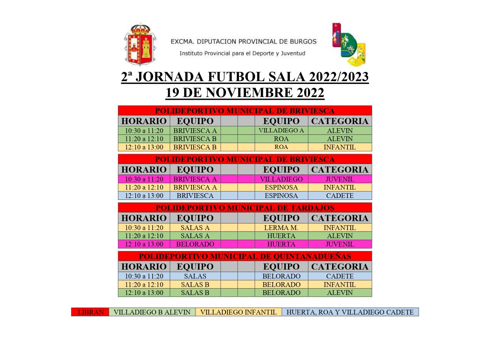 Los polideportivos municipales de Briviesca, Tardajos y Quintanadueñas acogerán los partidos de la segunda jornada de fútbol sala masculino de Juegos Escolares en las categorías de alevín, cadete, infantil y juvenil.