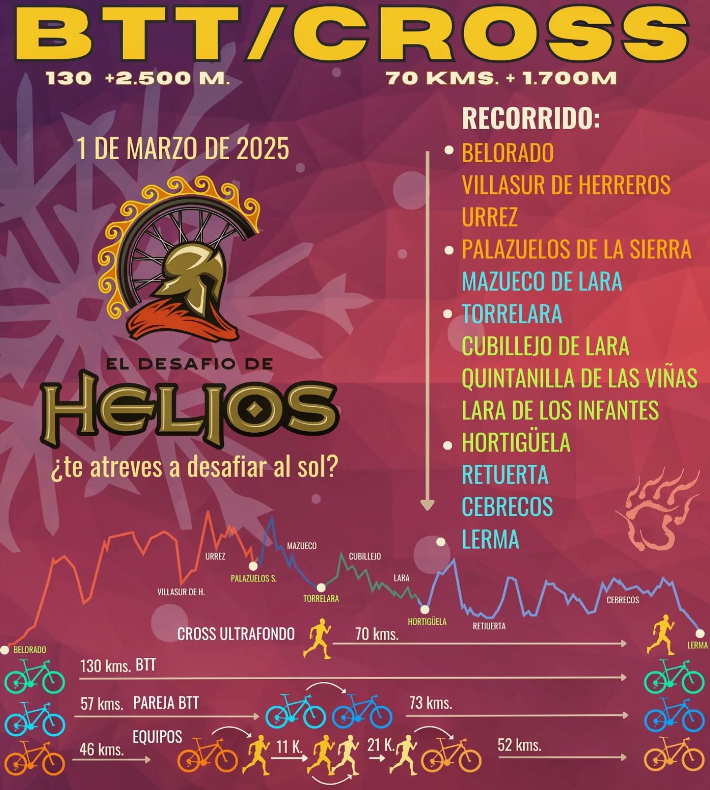 El Desafío de Helios es mucho más que una marcha de montaña al uso; es una prueba de resistencia que combina la pasión por los retos, el deporte y el espíritu aventurero. Los participantes tendrán la oportunidad de enfrentarse al sol en solitario en modalidad de cross; equipos a relevos (4) o en un duatlón que une cross y BTT.