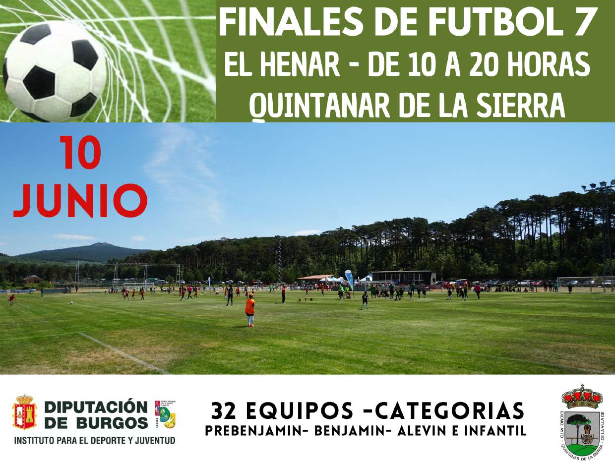 El próximo sábado día 10 de junio, de 11:00 a 19:00 horas, se celebrará la fase final del XVII Circuito Provincial Escolar de Fútbol 7 en el Campo "El Henar" de Quintanar de la Sierra, para determinar los campeones del Circuito de cada categoría: Pre benjamín, Benjamín, Alevín, Infantil masculino e Infantil femenino.