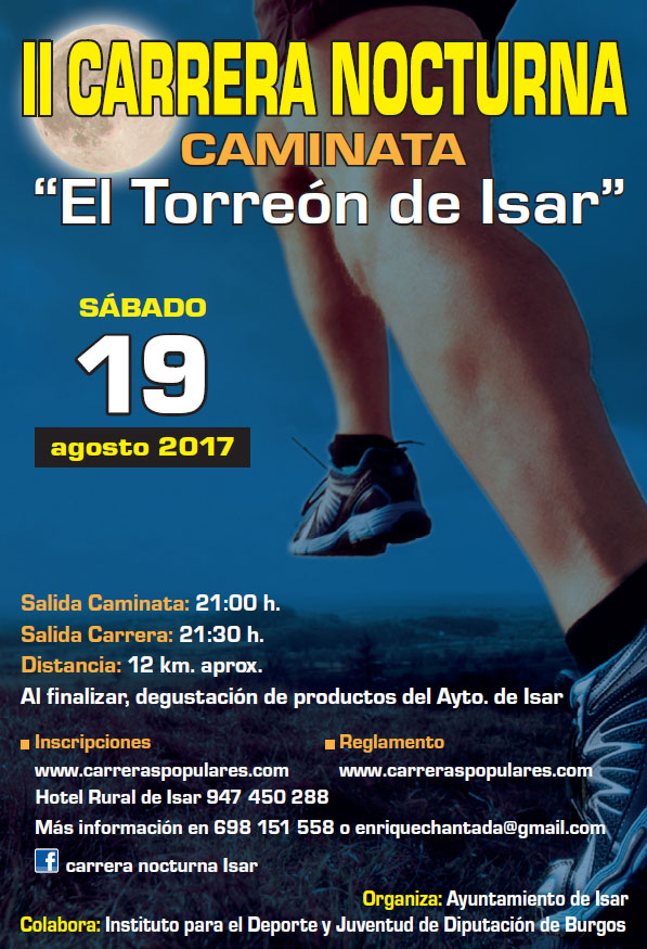 El próximo 19 de agosto se celebrará la segunda edición de la Carrera - Caminata Nocturna "El Torreón de Isar", con una distancia de 12 kilómetros. La salida de la caminata será a las 21:00 h., media hora más tarde, saldrán los corredores. Al finalizar, habrá degustación de productos.