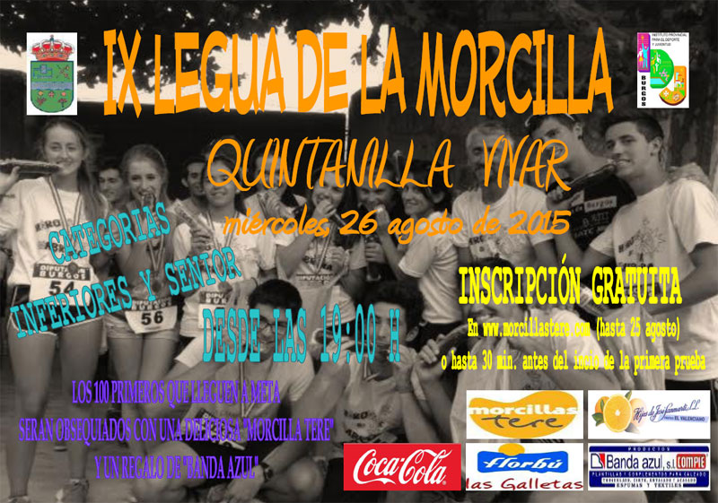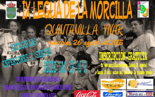 El Ayuntamiento de Quintanilla Vivar, la Asociación Pin-Pon y la Asociación Morocisla, junto al Instituto Provincial para el deporte y Juventud, organizan la IX Legua de la Morcilla. Inscripciones en www.morcillastere.com (hasta el 25 agosto) o el mismo día de la carrera se abrirán a las 17:00 h. y se cerrarán 30 minutos antes de la primera carrera.