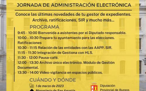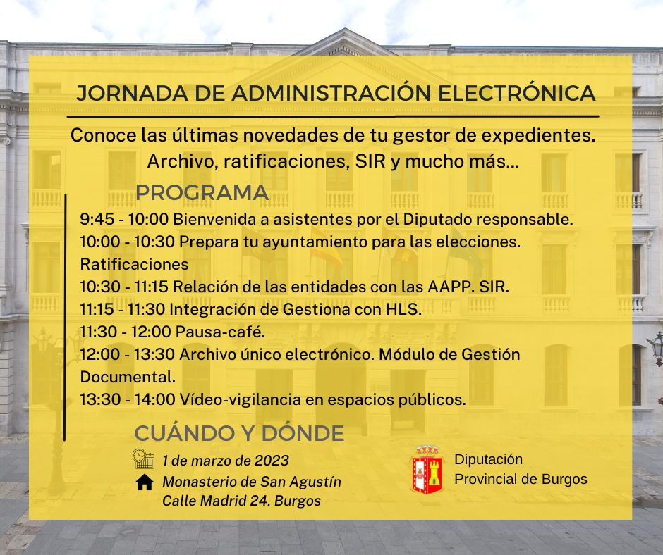 Dado que el gestor de expedientes Gestiona cuenta con un nuevo módulo de archivo, la Diputación de Burgos organiza una jornada donde se mostrará el funcionamiento del mismo, entre otros temas.   La jornada se celebrará el día 1 de marzo de 9:45 a 14 horas en el Monasterio de San Agustín (Calle Madrid 24, Burgos)   Adjunto a esta noticia se encuentra el programa correspondiente.