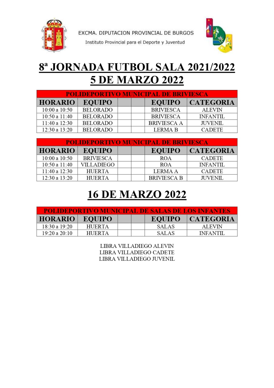 8ª jornada de Fútbol Sala: Lugar: Briviesca, Roa de Duero (1 de marzo) y Salas de los Infantes (16 de marzo). Hora: 09:30 h.
