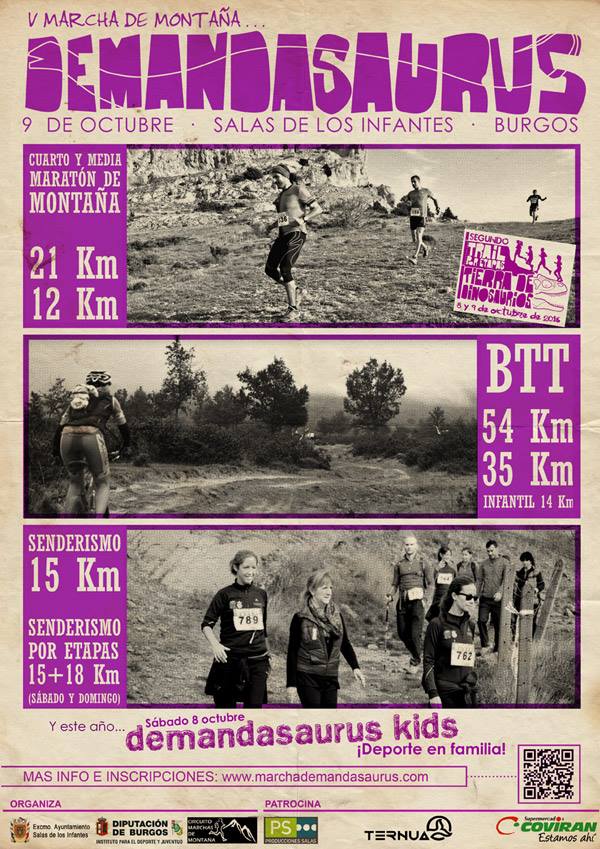 El 1 de agosto se abre el plazo de inscripciones de la V Marcha de Montaña Demandasaurus y el II Trail por Etapas Tierra de Dinosaurios, que tendrán lugar los días 8 y 9 de octubre de 2016 en Salas de los Infantes (Burgos). Este año viene cargado de novedades que nos irán revelando a lo largo de los próximos días.