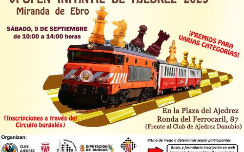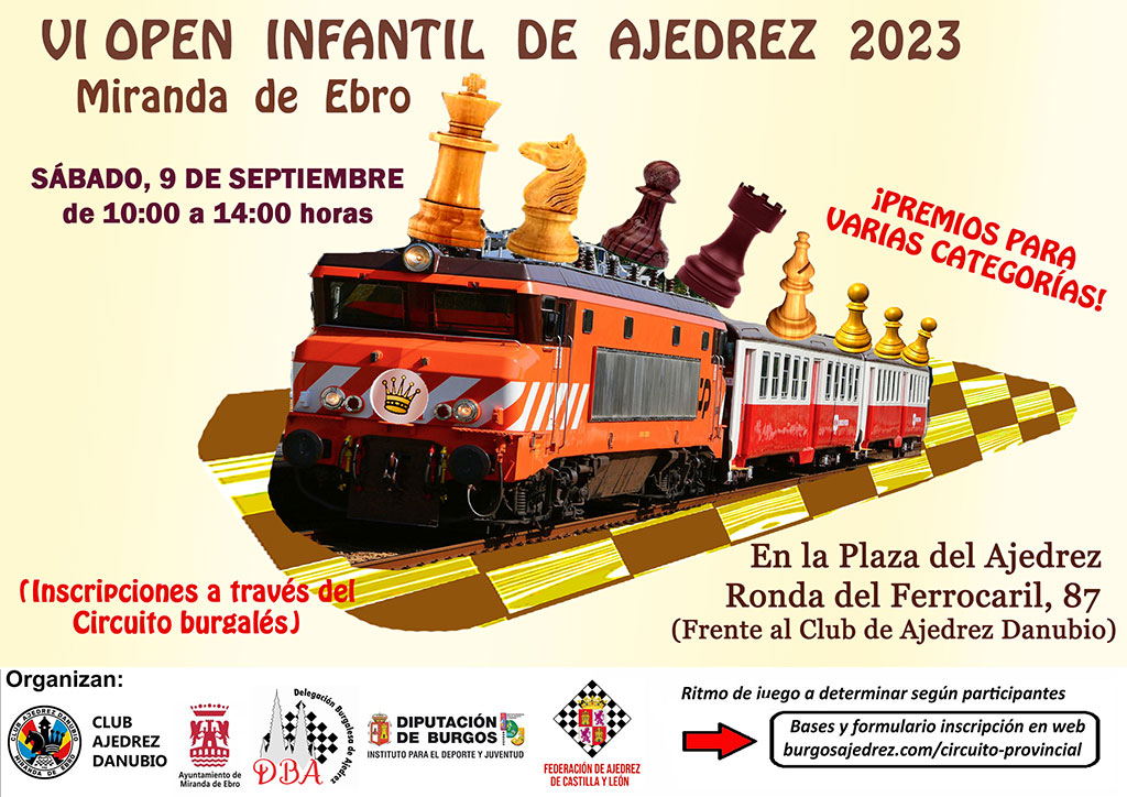 Penúltima prueba puntuable del VIII Circuito Provincial de Ajedrez en la categoría de infantil. Se celebrará el próximo sábado 9 de septiembre en la Ronda del Ferrocarril, 87 “Plaza del Ajedrez” (frente a la sede Club Ajedrez Danubio de Miranda de Ebro).
