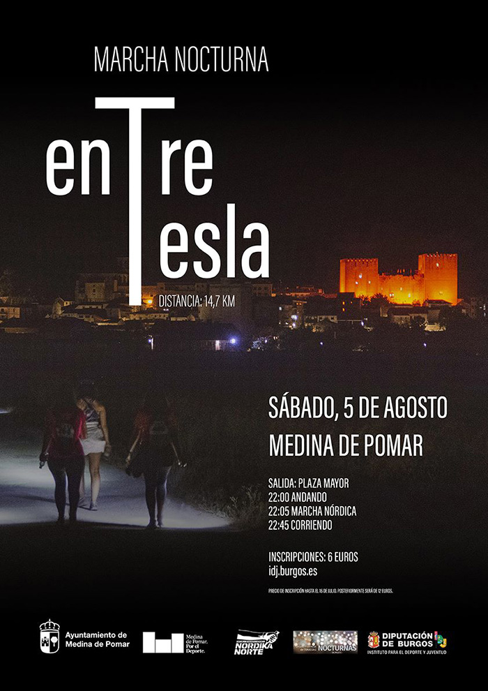 La Entre-Tesla, perteneciente al Circuito Provincial de Travesías Nocturnas, engloba tres modalidades; andando, marcha nórdica y corriendo, sobre un recorrido circular de 13,7 km. Se celebrará en Medina de Pomar el próximo sábado 5 de agosto.