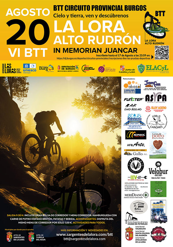 La 6ª edición de la prueba que se celebrará en Sargentes de La Lora el próximo domingo 20 de agosto será la 11ª prueba puntuable del XIII Circuito Provincial de BTT. Será un punto de encuentro donde el deporte y el patrimonio van de la mano, donde se puede conocer todo el territorio de manera directa, disfrutando de espacios naturales reconocidos como son el Parque Natural Hoces de Alto Ebro y Rudrón y el Geoparque de Las Loras.