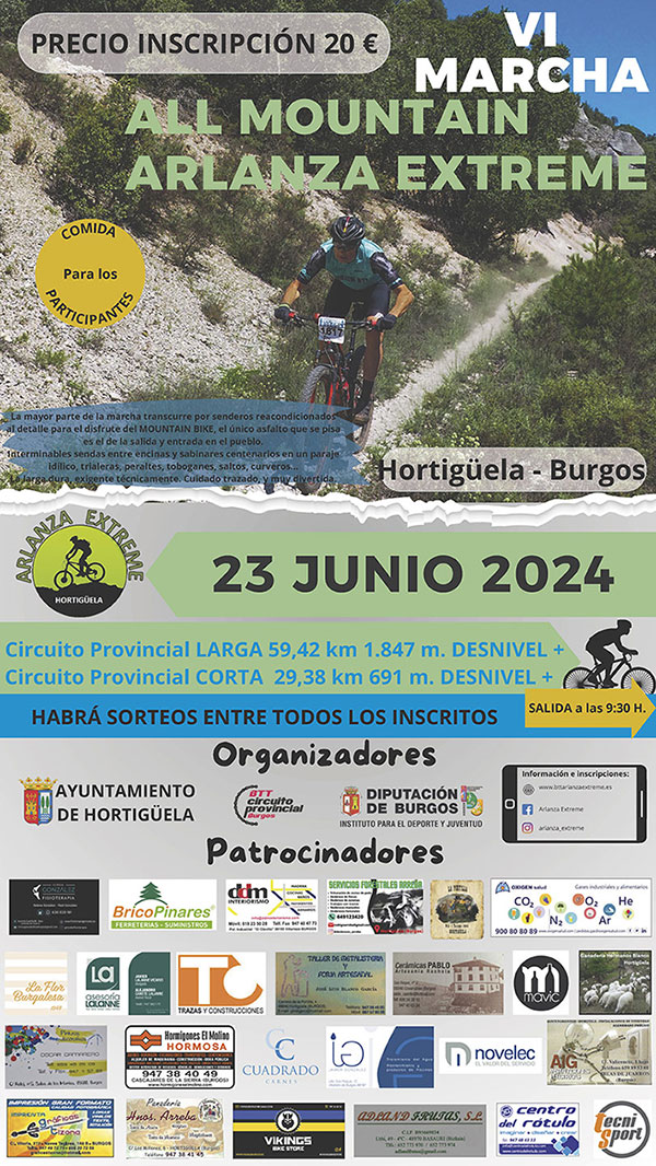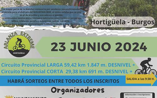 El Ayuntamiento de Hortigüela y el Instituto Provincial para el Deporte y Juventud de la Diputación Provincial de Burgos organizan la 6ª marcha BTT Arlanza Extreme que tendrá lugar el domingo 23 de junio de 2024, con salida y llegada en la Plaza Mayor de Hortigüela (Burgos). Será la 7ª prueba puntuable del XIV Circuito Provincial de BTT "Diputación de Burgos".