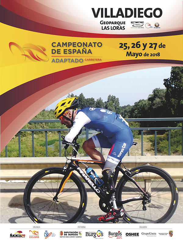 FUCICAM, la Real Federación Española de Ciclismo (RFEC) y la Federación de Ciclismo de Castilla y León (FCCL), con el patrocinio de la Diputación de Burgos y del Ayuntamiento de VILLADIEGO, convocan el 9º CAMPEONATO DE ESPAÑA DE CICLISMO ADAPTADO EN RUTA a celebrar en el municipio de Villadiego (Burgos) los días 25, 26 y 27 de Mayo de 2018.