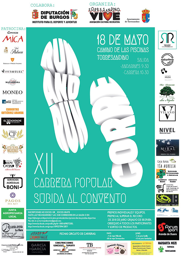 Torresandino acogerá la 12ª edición de la Carrera Popular "Subida al Convento" sobre un recorrido de 7,9 km que discurrirá por el el camino que rodea al convento de Nuestra Señora de los Valles. Será el sábado 18 de mayo a partir de las 09:30 horas con la salida de los senderistas y a partir de las 10:30 h con la salida de los participantes de la carrera.