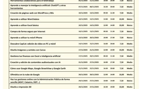 Estos cursos permiten adquirir nuevas competencias, desde informática básica hasta inteligencia artificial. Cada curso está impartido por expertos en la materia y cuenta con un enfoque práctico para aplicar lo aprendido de inmediato.
