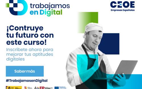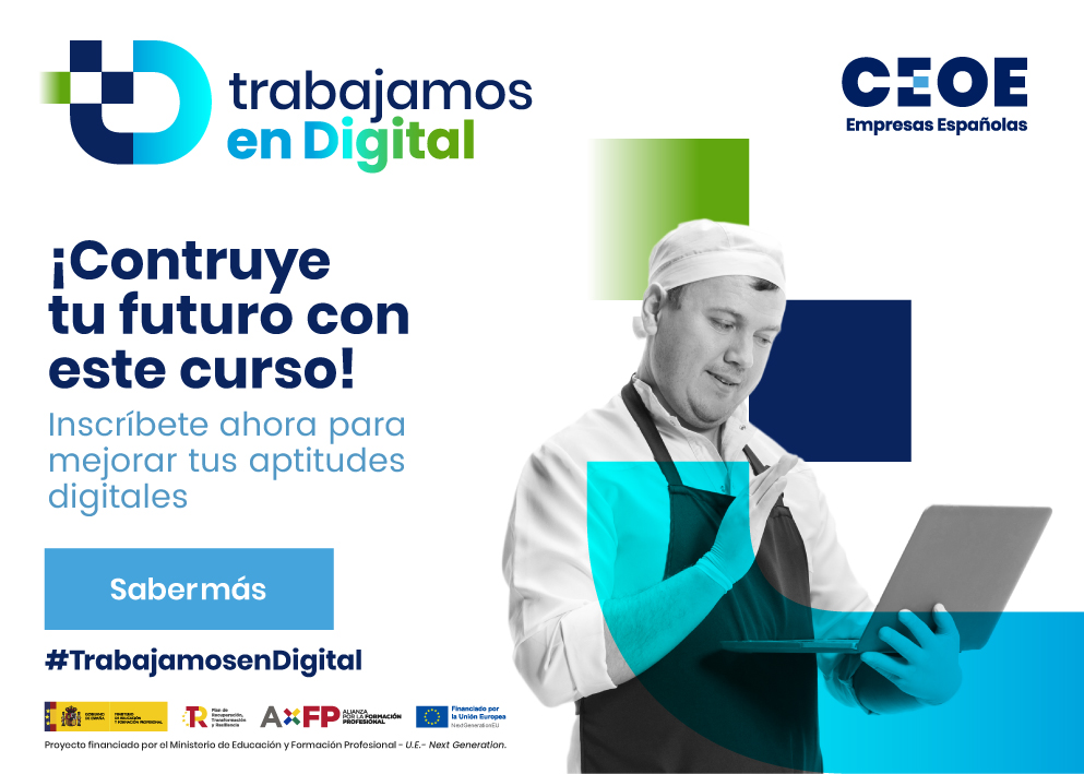 CEOE y CEPYME están desarrollando el proyecto “Trabajamos en Digital”, una iniciativa de formación para trabajadores ocupados por cuenta ajena o por cuenta propia, del sector privado y del sector público, con el objetivo de extender la alfabetización digital del entorno profesional, mejorar la empleabilidad y empoderar al alumnado con una formación actualizada.