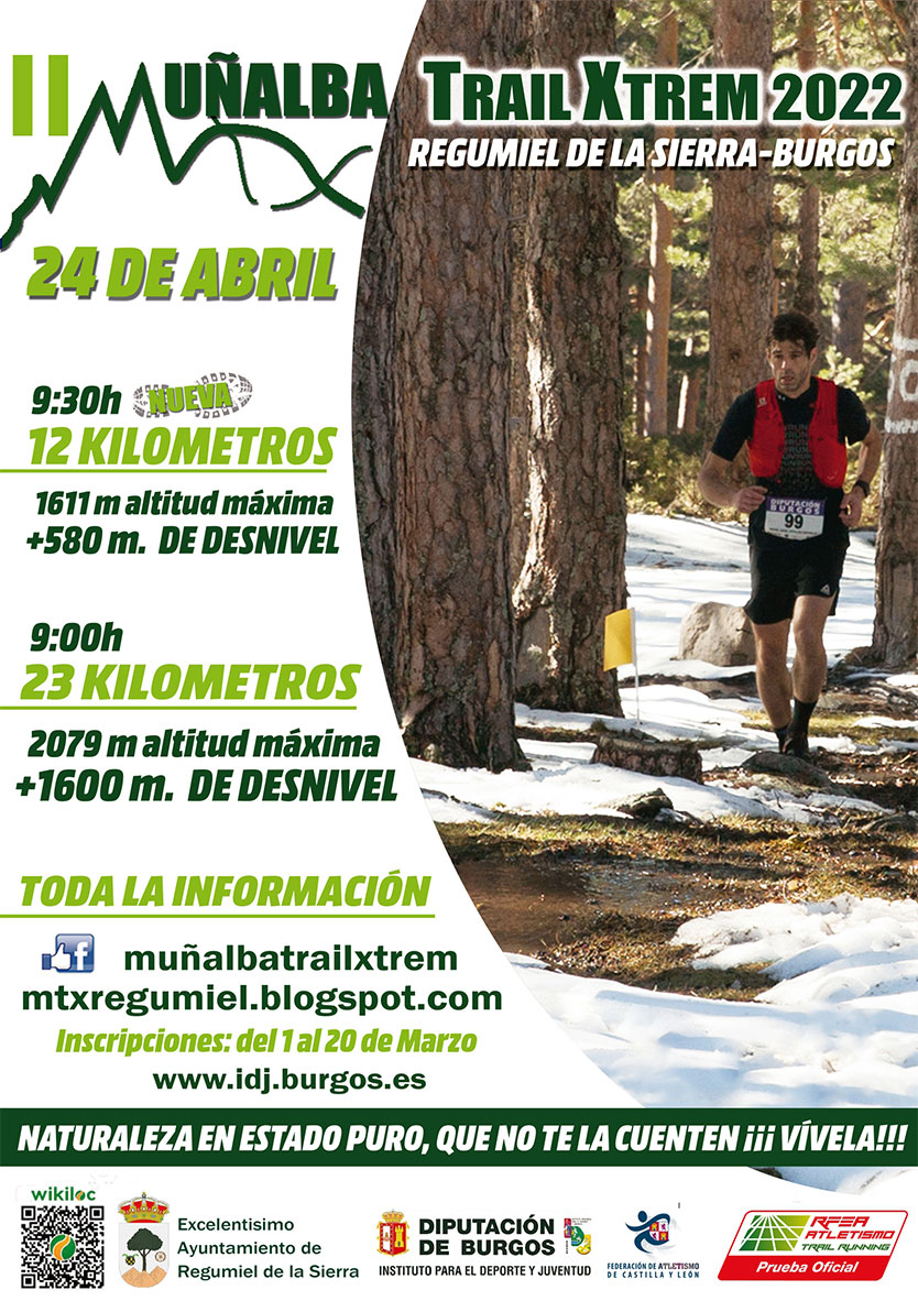Regumiel de la Sierra os quiere presentar la II edición de Muñalba Trail Xtrem, evento coorganizado por el Ayuntamiento de Regumiel de la Sierra, el CD Atletas del Zumel y el IDJ (Instituto provincial para el Deporte y Juventud de Burgos). En esta segunda aventura, pondremos toda la “carne en el asador”, mejorando aquellas cuestiones que pudimos flojear en la anterior edición y potenciando nuestras virtudes que, según nuestros participantes, fueron muchas y en especial con un recorrido que sin duda no os dejara indiferentes.