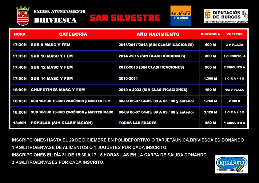 Como cada año por Navidad llega la San Silvestre de Briviesca, que se celebrará el domingo 31 de diciembre a partir de las 17:30 h y este año lo hace con alguna novedad importante como lo es el cambio de recorrido. Lo que no cambia es el espíritu solidario y de nuevo la inscripción se realizará donando alimentos para Cáritas Briviesca o juguetes para Cruz Roja Briviesca.