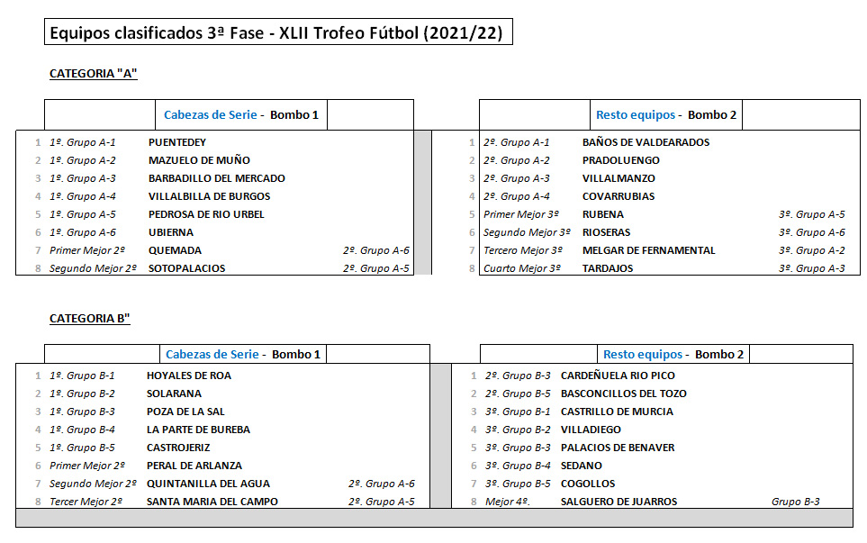 Mañana, jueves 26 de mayo, se celebrará el sorteo para determinar las eliminatorias de octavos, cuartos, semifinales y final del XLII Trofeo de Fútbol "Diputación de Burgos" temporada 21/22. Tendrá lugar en el Salón de Actos del Monasterio de San Agustín (Calle Madrid, 24) a las 11:00 h.